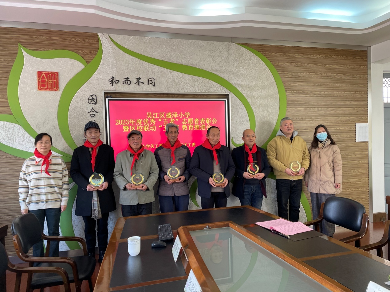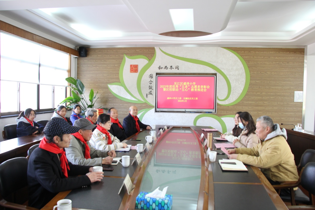 1月16日下午,盛泽小学在三楼西会议室举行2023年度优秀“五老”志愿者表彰会暨区校联动“五心”教育推进会,本次会议由学校少工委、关工委联合盛泽镇目澜社区共同举办。