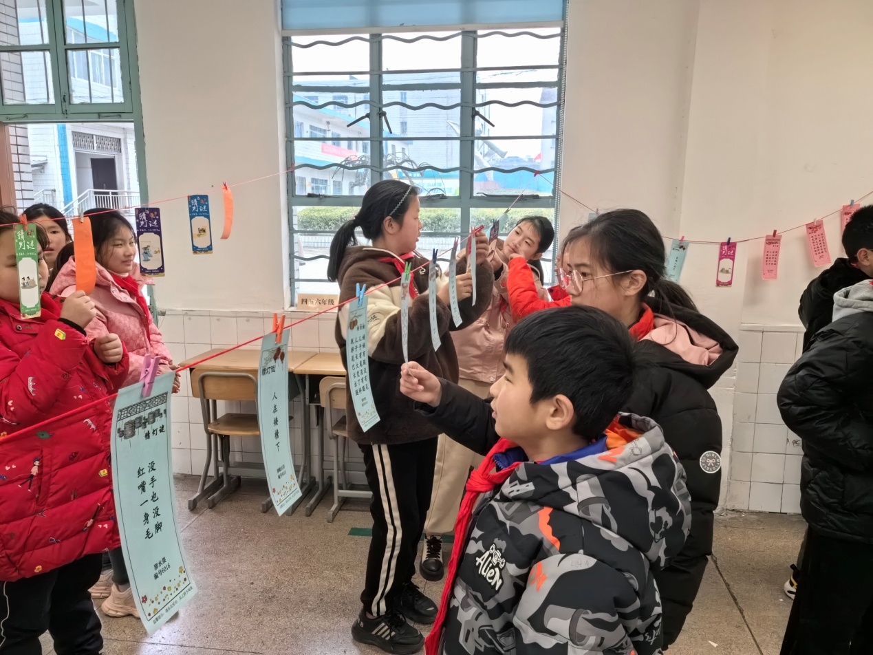 2月23日当天,在各班班会上,学生们了解了元宵节的起源、发展历程以及传统习俗。接着,一、二年级的同学们带来了各种自制的精美花灯,将教室里装饰一新,添上浓郁的节日氛围。三、四年级的各班劳动小达人,向食堂的工作人员学习如何动手做元宵,最后,好吃的元宵大家一起分享。五、六年级的同学在各班级猜灯谜比赛中选出优胜代表,参加校猜灯谜比赛赢取奖品,同学们跃跃欲试,积极参与到活动中,自信展示他们的聪明才智。