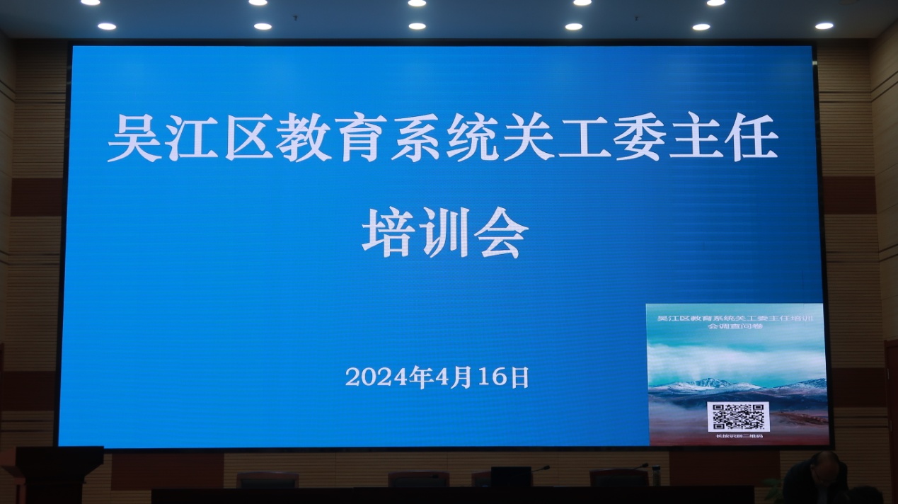 为深入贯彻落实习近平新时代中国特色社会主义思想和习近平总书记对关心下一代工作的重要指示,贯彻落实中办、国办印发的《关于加强新时代关心下一代工作委员会工作的意见》(以下简称《意见》)和《中共教育部党组关于加强新时代全国教育系统关心下一代工作委员会工作的意见》(教党【2021】34号)文件精神。4月16日,苏州市吴江区教育系统关工委在教师发展中心召开了关工委主任培训会。原中共苏州市教育局党工委委员、苏州市教育局关工委常务副主任沈宇,苏州市教育局关工委常务副主任吴海梁;区教育局关工委常务副主任俞弘声、副主任冯建华;全区各中小学关工委主任、各片片长及讲师团成员参加了此次培训。会议由俞弘声同志主持。