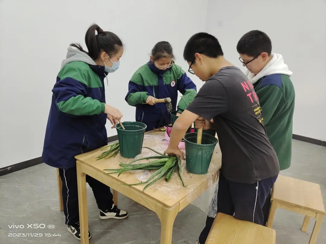 在草长莺飞,春意盎然之际,为了营造美丽的校园环境,培养学生热爱劳动的美好品德,八坼中学学生在老师们的带领下,学习植树技能,参与植树活动。他们拿起铁锹、水桶等劳动工具,有模有样地干起来,他们相互配合,清理、挖坑、填土、浇水,每个人都忙得不亦乐乎,在流汗的同时,收获满满的幸福。在袁老师的讲解下,同学们了解到移栽和扦插的相关知识,并且齐心协力地动手完成了芦荟移栽的任务,见证了劳动之美。学生们挂上DIY的小卡片,上面写着温馨提示,希望过路之人一起守护这份劳动果实,一起守护校园绿意。