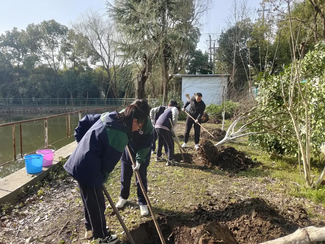 在草长莺飞,春意盎然之际,为了营造美丽的校园环境,培养学生热爱劳动的美好品德,八坼中学学生在老师们的带领下,学习植树技能,参与植树活动。他们拿起铁锹、水桶等劳动工具,有模有样地干起来,他们相互配合,清理、挖坑、填土、浇水,每个人都忙得不亦乐乎,在流汗的同时,收获满满的幸福。在袁老师的讲解下,同学们了解到移栽和扦插的相关知识,并且齐心协力地动手完成了芦荟移栽的任务,见证了劳动之美。学生们挂上DIY的小卡片,上面写着温馨提示,希望过路之人一起守护这份劳动果实,一起守护校园绿意。