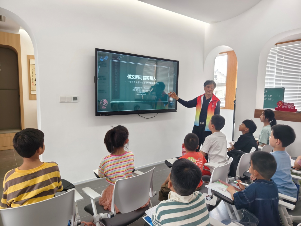 活动伊始,退休教师周明金以深入浅出的方式,向孩子们阐述了何为“文明苏州人”、文明的内涵等内容。他详细解读了“文明新风”“文明礼仪”和“文明出行”等文明行为,并强调了在日常生活中应做到尊老爱幼、礼貌待人、勤俭节约等基本道德规范。