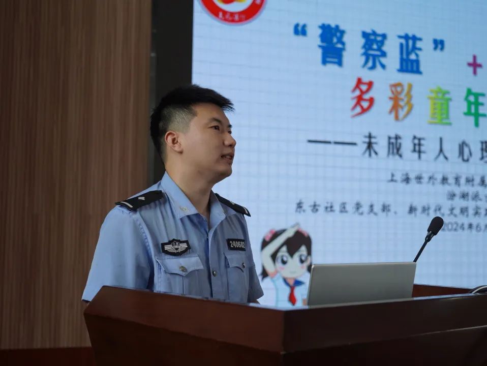 浇花浇根,育人育心。为了护航青少年健康成长,提高他们明辨是非和自我保护的能力,6月12日下午,东古社区关工委、上海世外教育附属汾湖实验小学、汾湖派出所共同开展了“警察蓝”+“红领巾”,多彩童年反欺凌——未成年人心理健康教育活动。