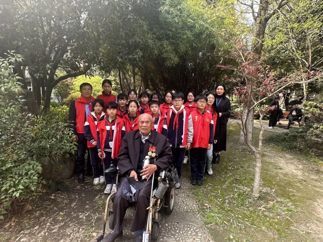 接下来的志愿活动中,少先队员们身着红马甲,形成了一道亮丽的风景线。队员们先是慰问了高龄退役老兵,尊敬地向老人表达了问候。这位参加过朝鲜战争的老兵亲切地向同学们讲述了他的抗战岁月,同学们深受感触,并与这位值得敬仰的老人合影。接着,队员们又开展了捡拾垃圾志愿服务活动。他们有的手拿捡拾夹、有的提着塑料袋,个个干劲十足,对松陵公园里的果皮、烟头、塑料袋等各种垃圾进行地毯式清理,用实际行动守护我们的美丽公园。