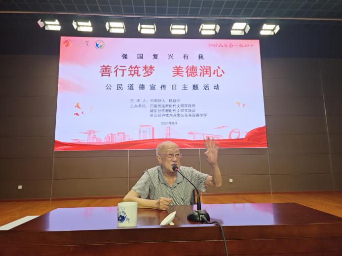 一年一度的公民道德宣传日即将到来,这是一个特殊的时刻,一个我们用行动诠释美德,用心感受善良的日子。9月19日,花港迎春小学联合街道社区邀请了“中国好人”杨自中爷爷来为花小学子们作讲座。