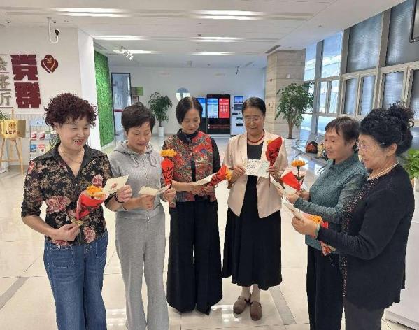 九点,“重阳节”主题系列活动正式开始。志愿者们首先为老人们献上精心准备的花束与贺卡。