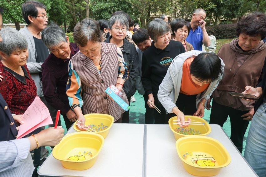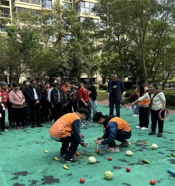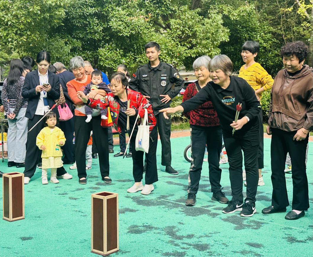 与此同时,“重阳节”社区运动会也在同步进行。此次趣味运动会设置了丰富多彩的项目,包括投壶、夹弹珠、套蔬菜等。