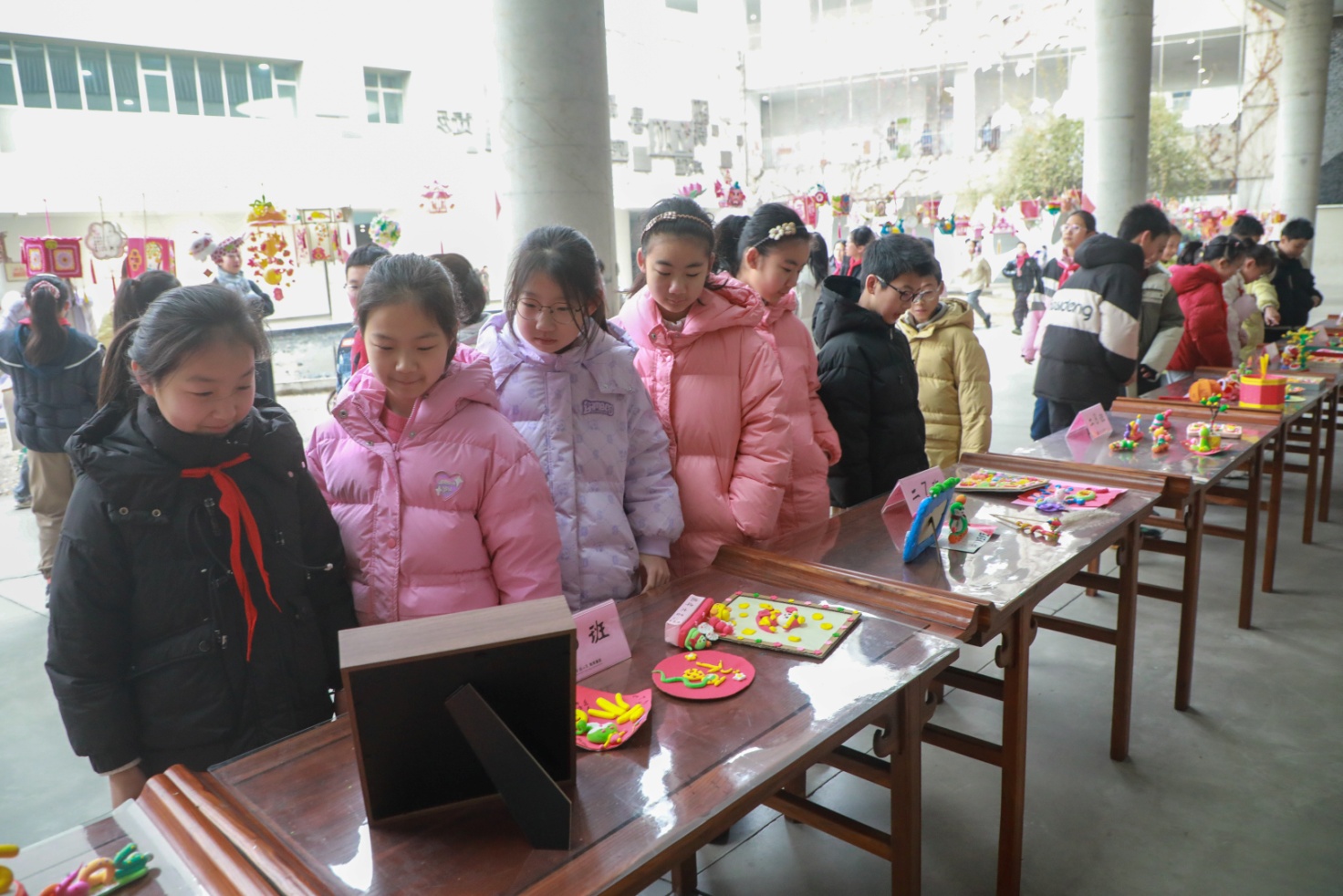 花灯下摆放着各班的手工彩泥作品-蛇年吉祥物,通过彩泥塑造出形态各异的蛇年吉祥物,孩子们用各种材料创作出充满喜庆和年味的作品。