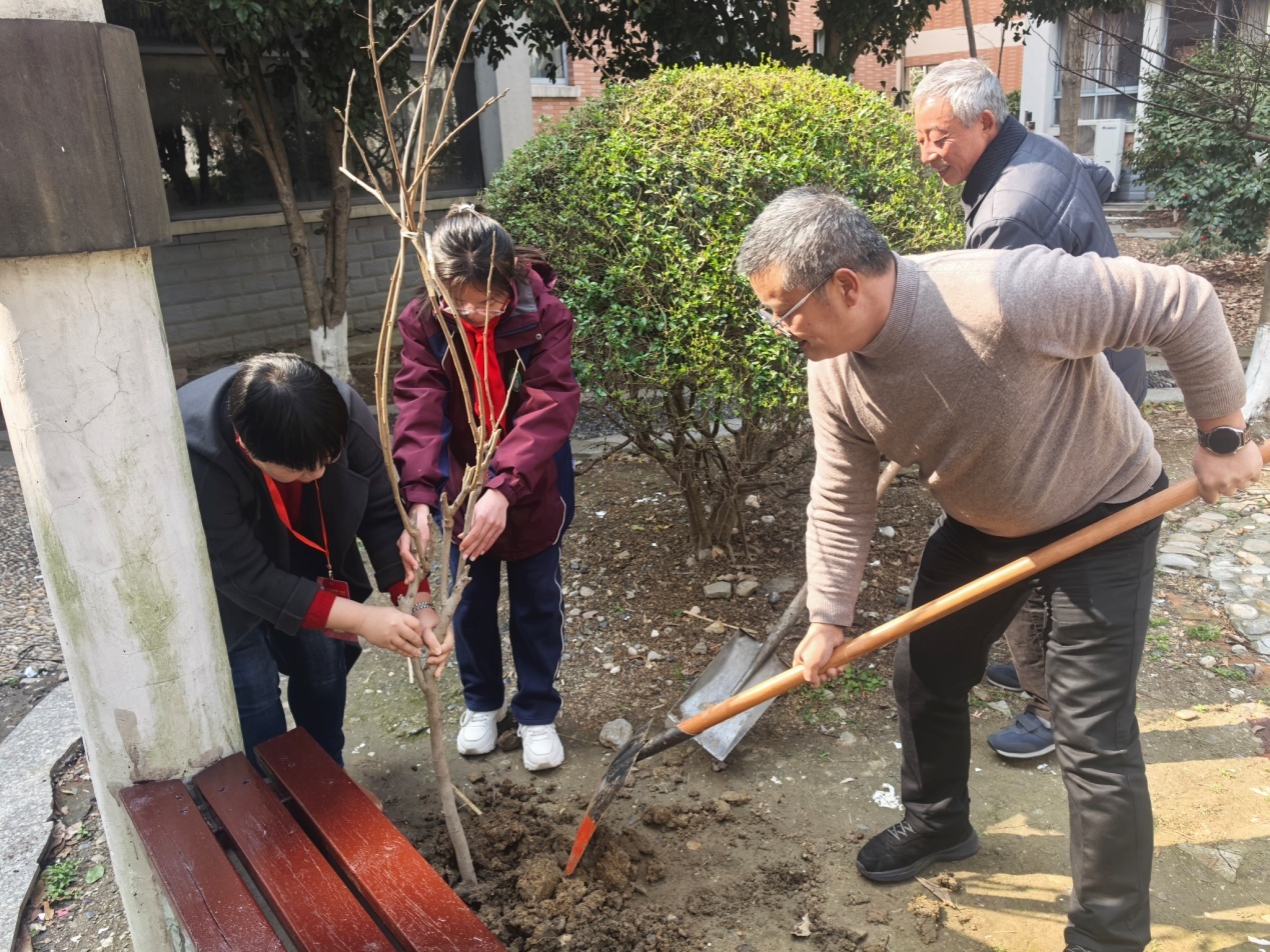 盛泽一中自1975年创办以来,历经风雨,于2005年迁入现址。姚家坝老校区那茂盛的紫藤,如同一中人的精神纽带,情深意长。3月6日,陆建荣书记、陈瑜校长与王钧谟老校长携手同学们,满怀热忱地共植新紫藤。新老两代校长与学子们齐心协力,将紫藤树苗轻轻植入肥沃的土壤,细心培土,缓缓浇水,每一个动作都饱含着对生命的敬畏与珍爱。阳光洒落,紫藤树苗仿佛在阳光下茁壮成长,我们的心中充满了对未来的无限期待与喜悦,愿这新植的紫藤流淌诗情,生机勃勃。