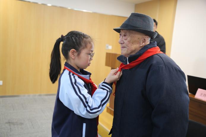沈忞乐:今天为杨自中爷爷亲手系上红领巾,我的心怦怦直跳。他慈祥的笑容像阳光洒在我心上,他的皱纹里藏着那么多温暖他人的故事。红领巾在他胸前飘扬时,我忽然懂了什么是“把爱传下去”。我要成为像杨爷爷那样的人,用小小的善举点亮别人的天空,做温暖他人的“小太阳”。