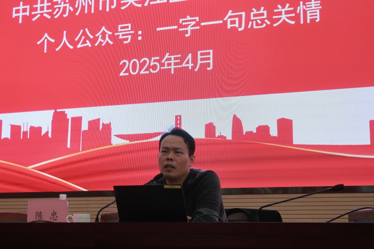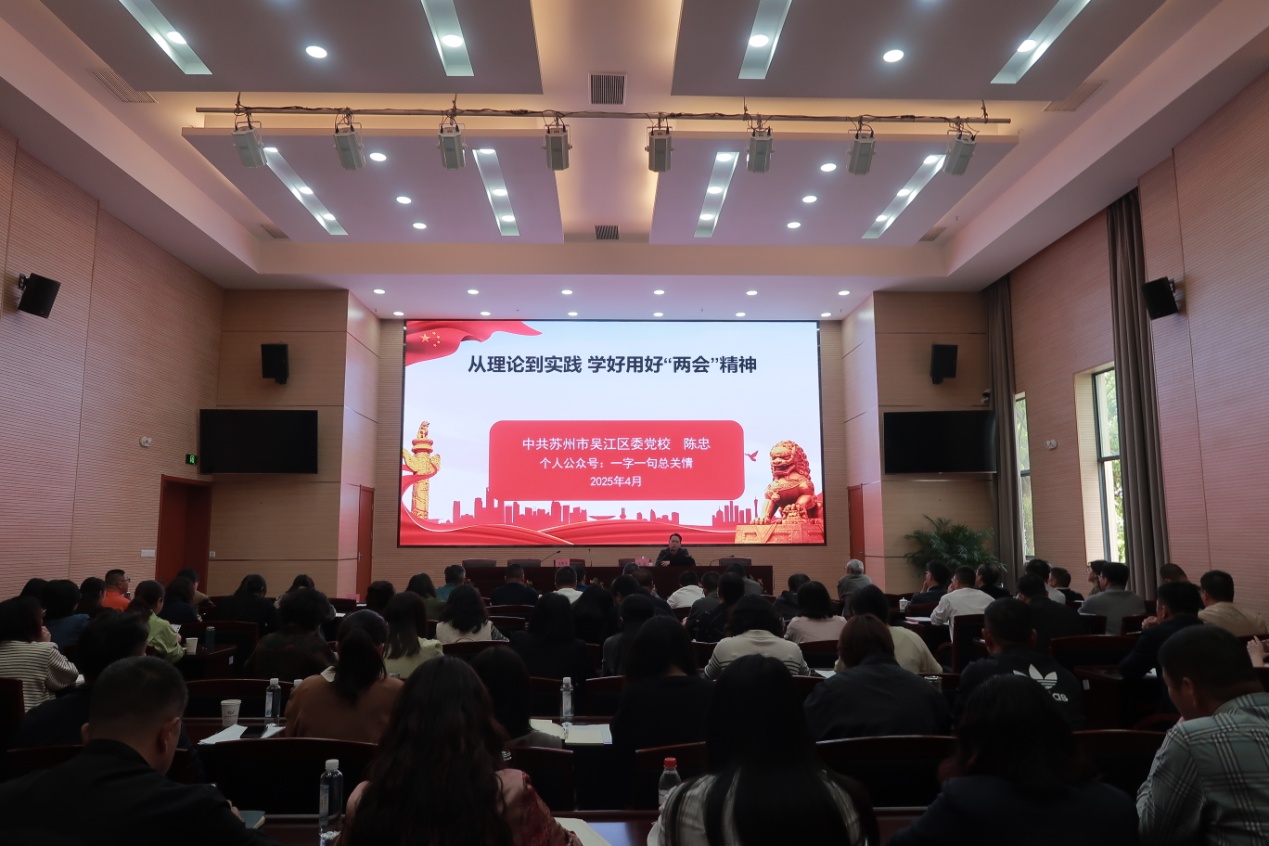 培训会上,中共苏州市吴江区委党校副校长陈忠带来《从理论到实践 学好用好“两会”精神》的精彩报告。陈校长从“坚持和加强党的全面领导、中国特色社会主义伟大事业理论框架、党的二十届三中全会五年决策部署、总书记‘两会’三年讲话精神及2025政府工作报告关键词”五个维度深入剖析,重点解读“两个维护、三个统一、四个迫切需要、五大特色、七个聚焦”等重要内涵与精神实质。报告深入浅出,内容丰富详实,紧密联系当下教育形势与吴江教育实际,为参会人员呈上了一场兼具理论高度与实践深度的思想盛宴。
