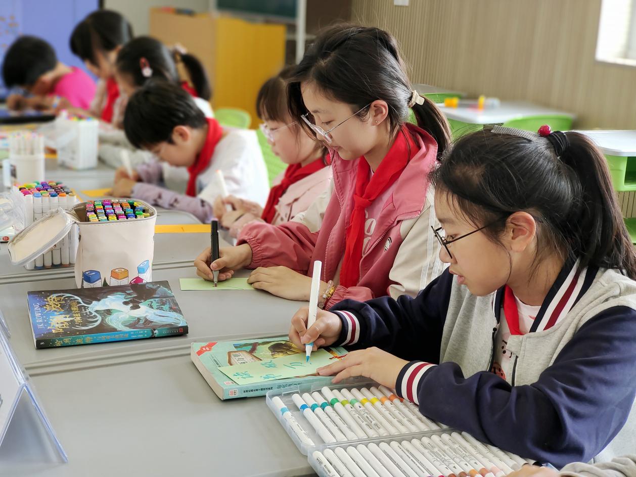 活动进入第二环节,孩子们拿起彩笔,展开想象,用心绘制书签。一张张独一无二的书签在孩子们的笔下诞生,不仅展现了他们对书籍的热爱,也寄托了他们对未来的美好憧憬。