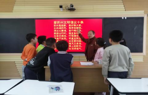 “苏州是我家,美好靠大家。公共场所内,有序勿喧哗。演出比赛场,言行有修养,旅游出行时,相互多礼让。垃圾分类投,行驾遵交规。养宠不扰民,邻里互照应。尊老又爱幼,社区更和睦。勤俭拒浪费,移风又易俗。指尖传善意,网上树新风。你我爱苏州,生活添福气。”4月14日在芦墟实验小学的多功能教室里,传来了郎朗诵读声,芦墟关工委的五老志愿者张老师正在带领学生共同学习《爱苏州文明倡议十条》,张老师对学生说“苏州是充满福气的城市,文明是这座城市最美的风景。希望大家将文明倡议牢记心中,成为苏式文明的代言人。”