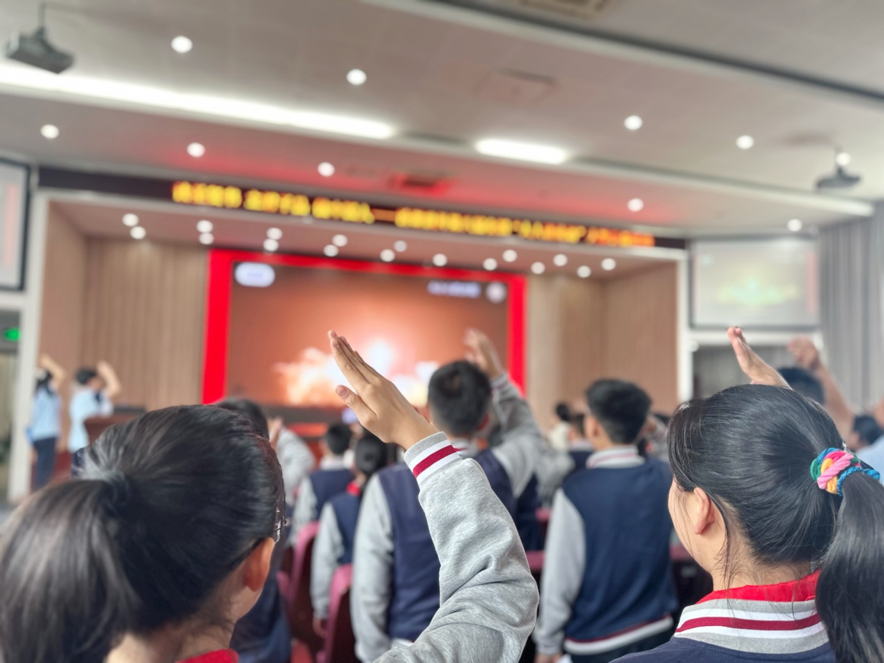 汾湖世外副校长查春晓发表了热情洋溢的讲话。她在讲话中强调了经典文化的重要价值,鼓励师生们在《论语》的经典篇章中汲取智慧,传承中华优秀传统文化,树立文化自信。她的话语如同一盏明灯,照亮了师生们诵读经典、传承文化的前行之路。东古社区书记潘玫也给同学们带来了寄语,她表示《论语》不仅是中华文化的瑰宝,更是我们立身处世的智慧指南。希望同学们在诵读中感悟,在感悟中成长,努力做有德之君子、好学之才子、博学之学子,让传统文化在新时代焕发活力!活动最后,全体师生在方可老师的带领下庄严礼诵:“为天地立心,为生民立命,为往圣继绝学,为万世开太平!”铿锵誓言,彰显文化传承的坚定信念。