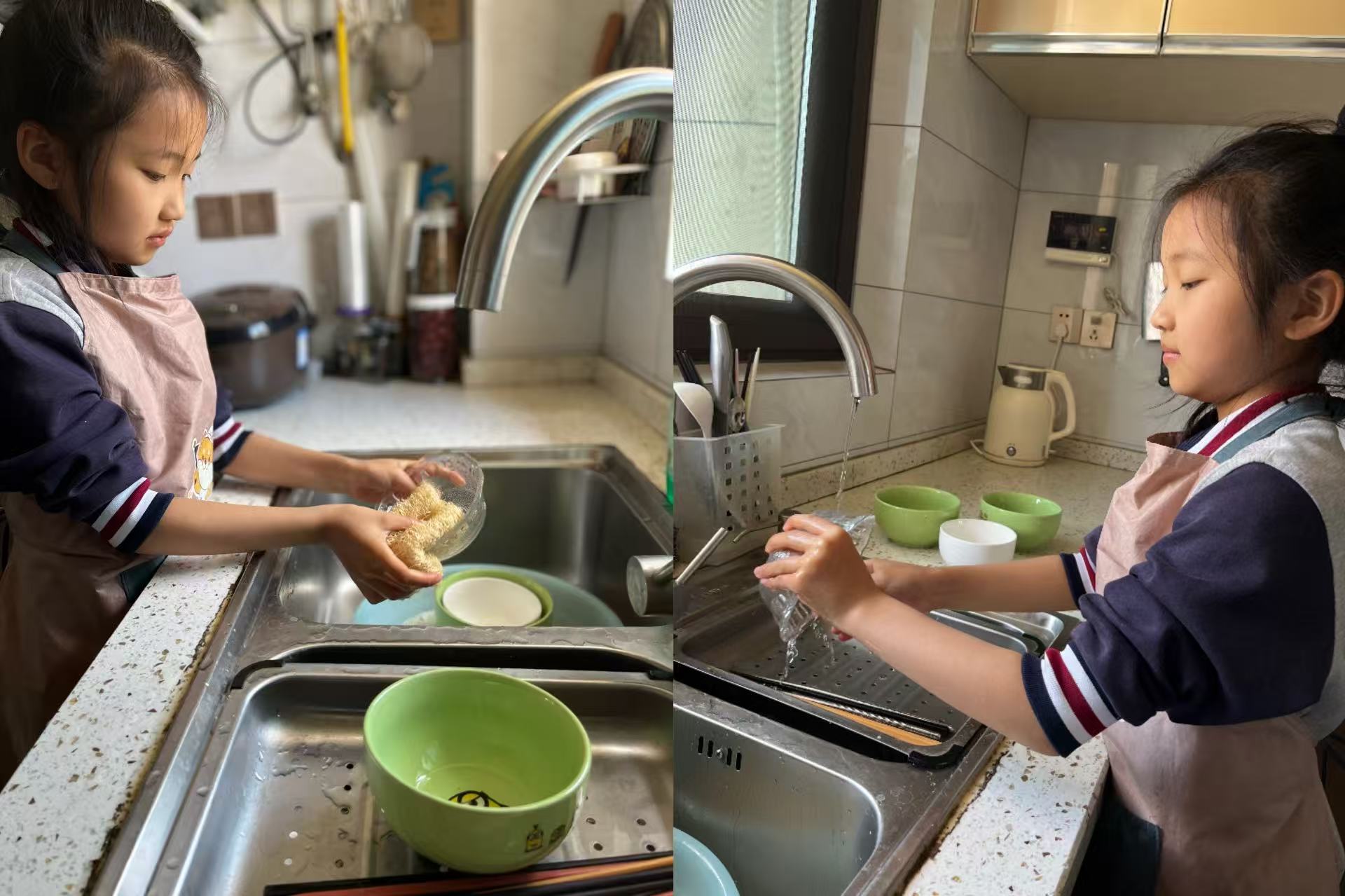 二、擦洗活动。中年级苹果娃选择洗碗、擦桌子等清洁工作。这些劳动看似不起眼,但细致仔细是不可缺少的重要部分。