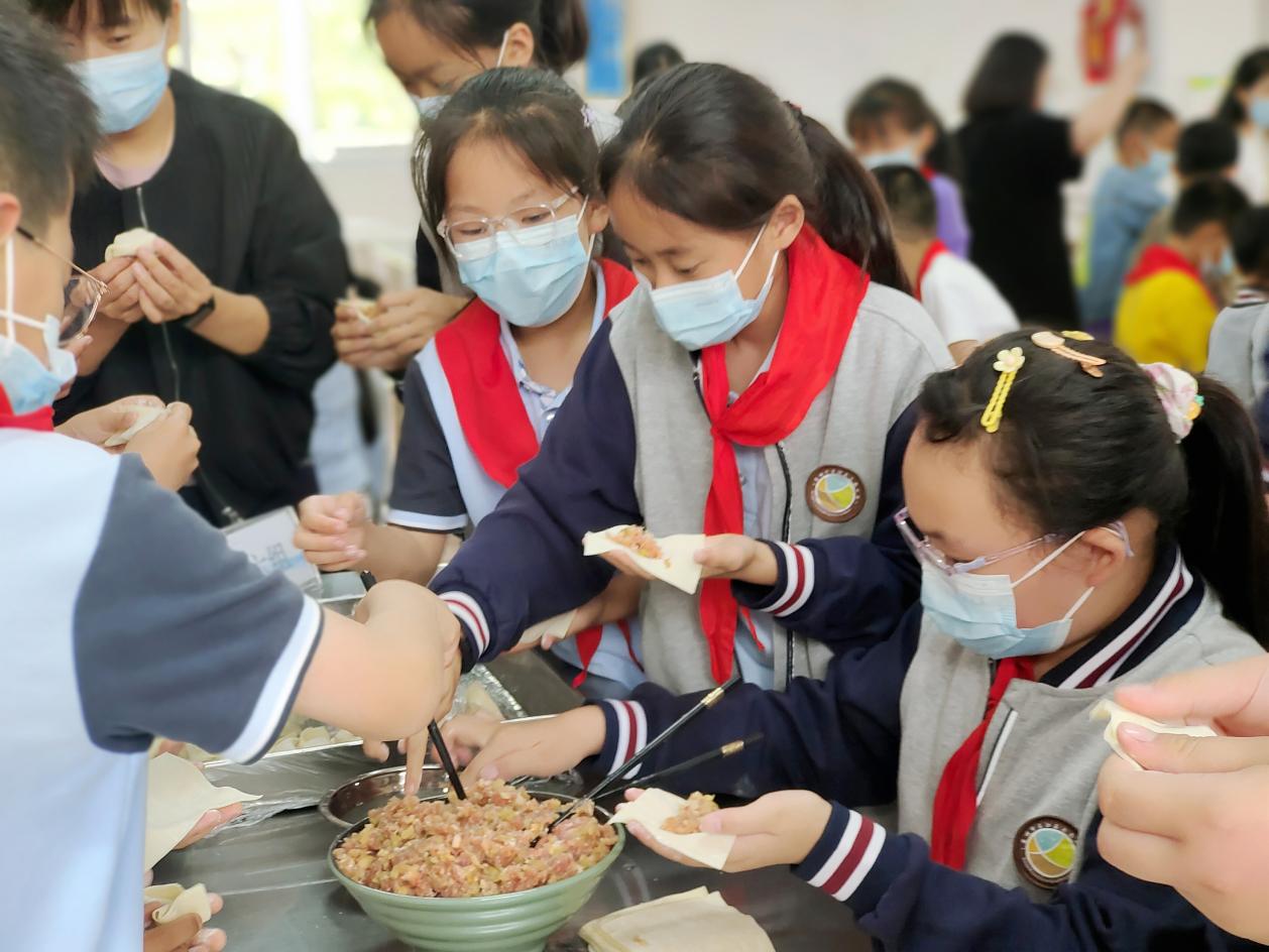 在“非遗小课堂”环节,沈娟芳老师化身“面点导师”,将七都传统美食“三鲜馄饨”的制作技艺搬进课堂。从揉面擀皮的力道把控,到馅料配比的精准拿捏,再到捏褶封口的巧劲运用,沈老师边示范边讲述“一擀一包”中蕴含的劳动智慧:“老底子手艺要靠手心温度,揉的是耐心,包的是心意。”学生们围站桌前,在面粉飘香中体验从面团到馄饨的蜕变过程。