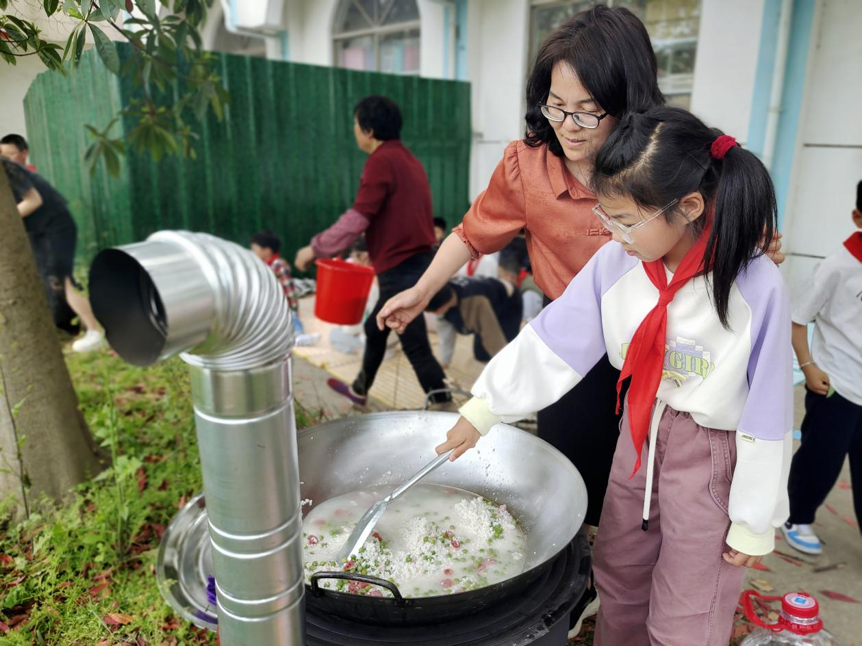 与此同时,沈明芳老师带领学生来到校园的“耕读园”,在园中架起土灶,开启了“野火饭”劳动实践活动。孩子们分工明确、协作有序:刀工组在沈老师的悉心指导下,将所有配料一一切好;掌勺组接过接力棒,翻炒出咸肉蚕豆的阵阵鲜香;生火组则在一旁专注调控火候。随着袅袅炊烟缓缓升起,锅铲与铁锅相互碰撞,奏响了一曲欢快的劳动乐章。