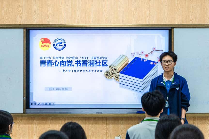在五四青年节来临之际,江苏省吴江中等专业学校关工委团委联合长板社区,以“青春心向党,书香润社区”为主题,举办“五四青年节”红色经典读书系列活动,旨在弘扬五四精神,激发青年学子的爱国热情与奋进动力,展现青年风采,凝聚青春力量。
