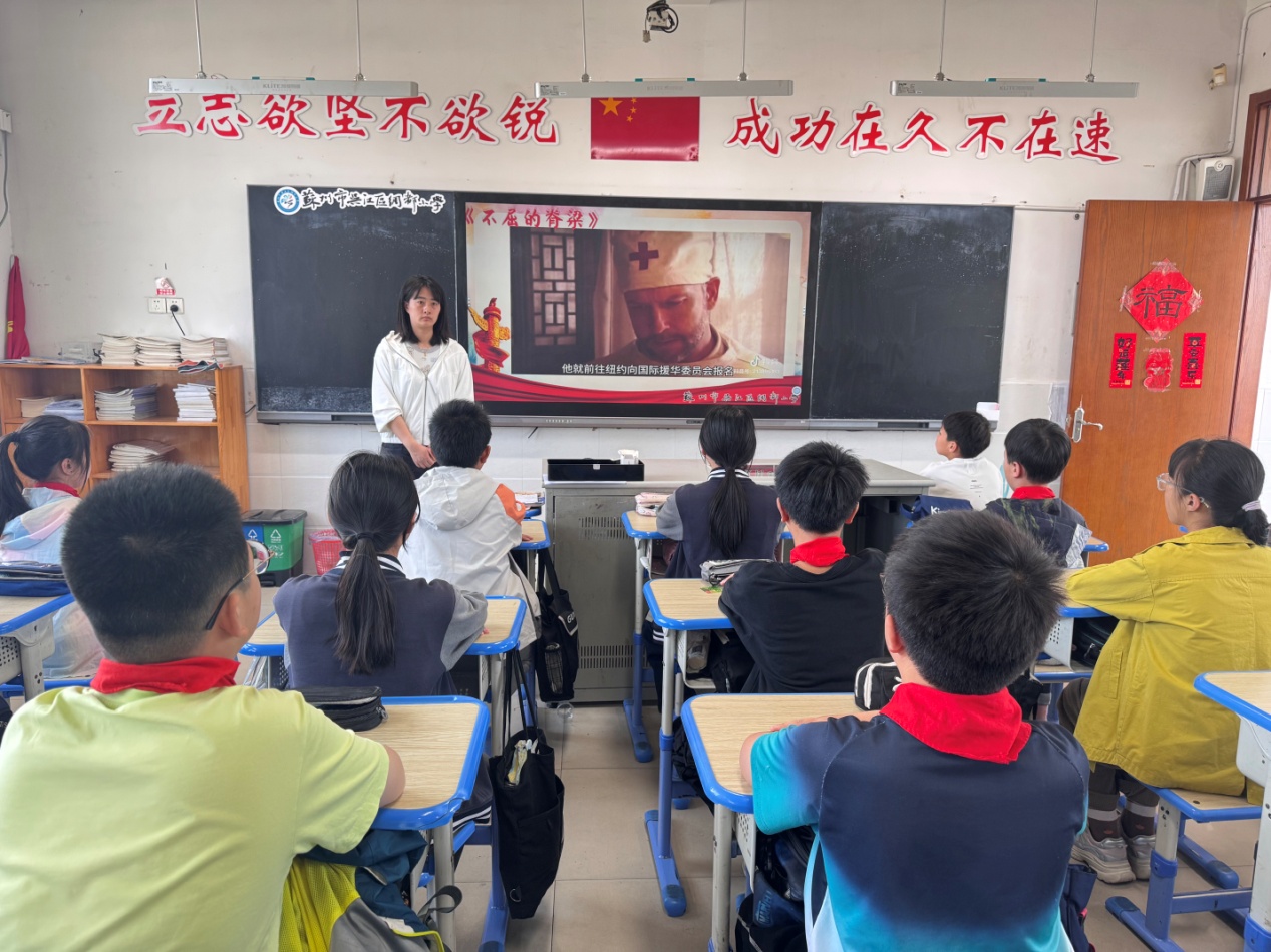 与此同时,学校组织三到六年级的学生整班观看杨靖宇和白求恩的故事。在播放过程中,学生们被杨靖宇在冰天雪地中顽强抗击日寇、直至壮烈牺牲的英勇事迹所震撼,也对白求恩不远万里来到中国、无私奉献的国际主义精神深感敬佩。观看结束后,许多学生表示,要向英雄们学习,珍惜今天来之不易的幸福生活。
