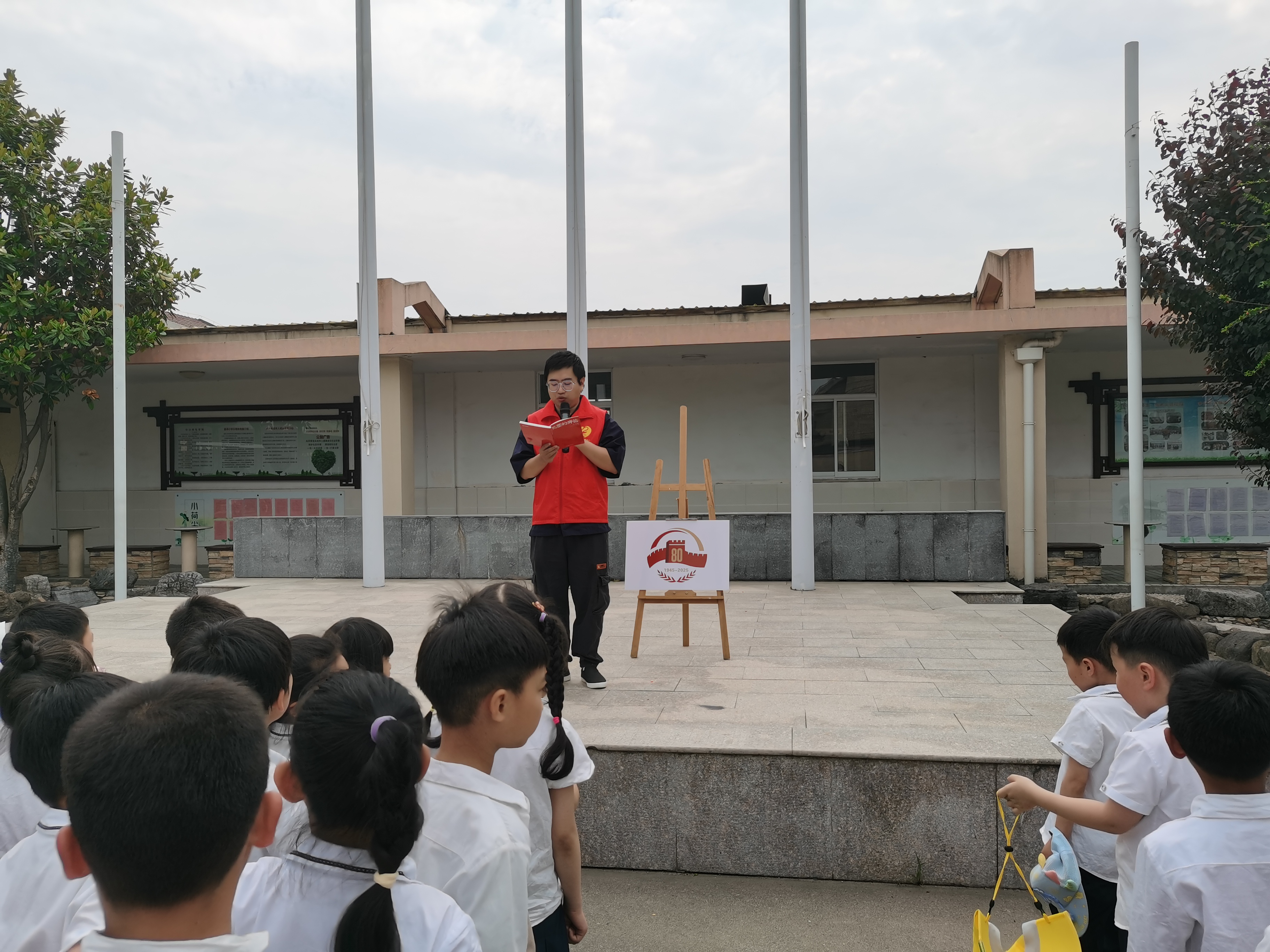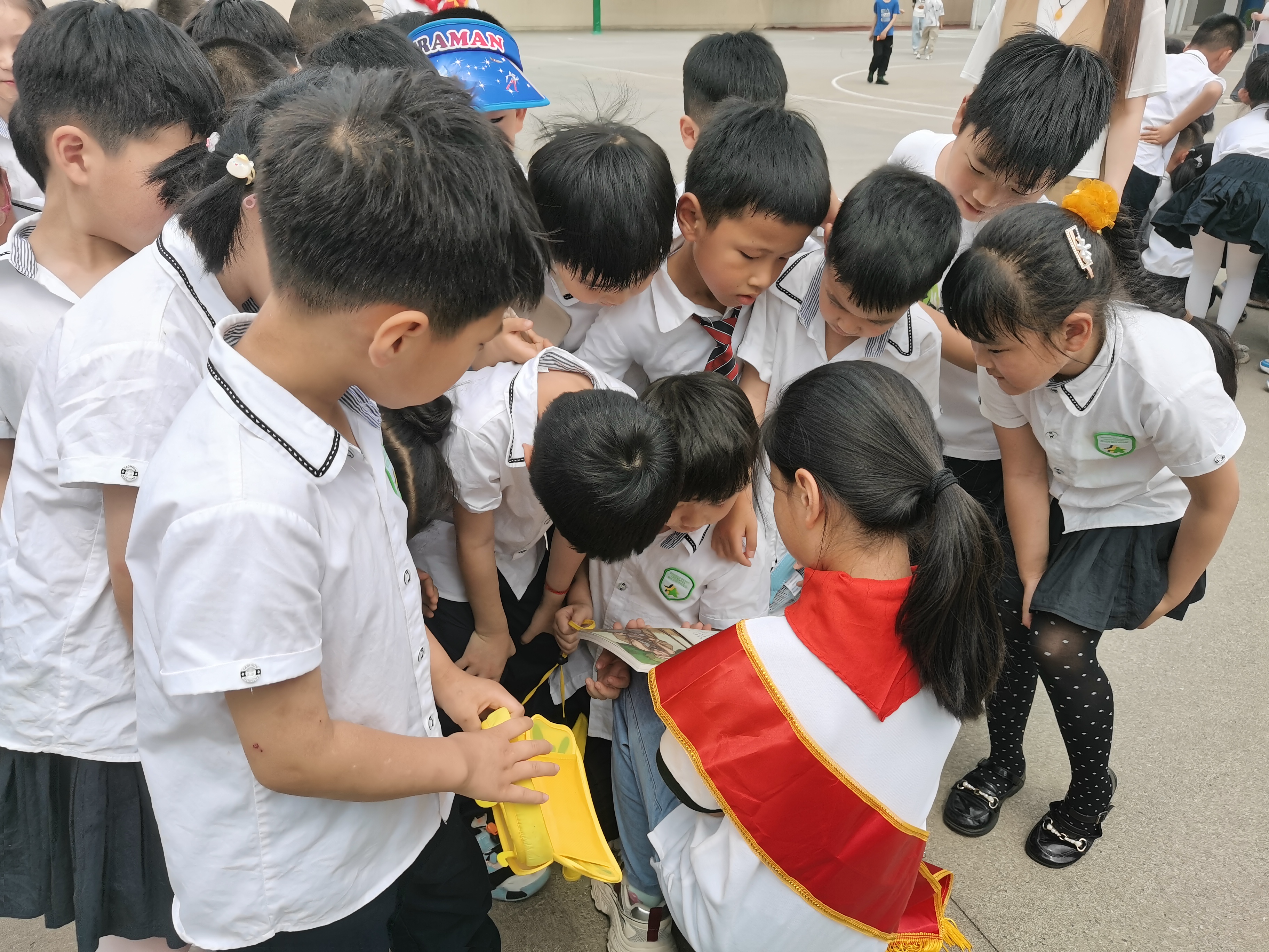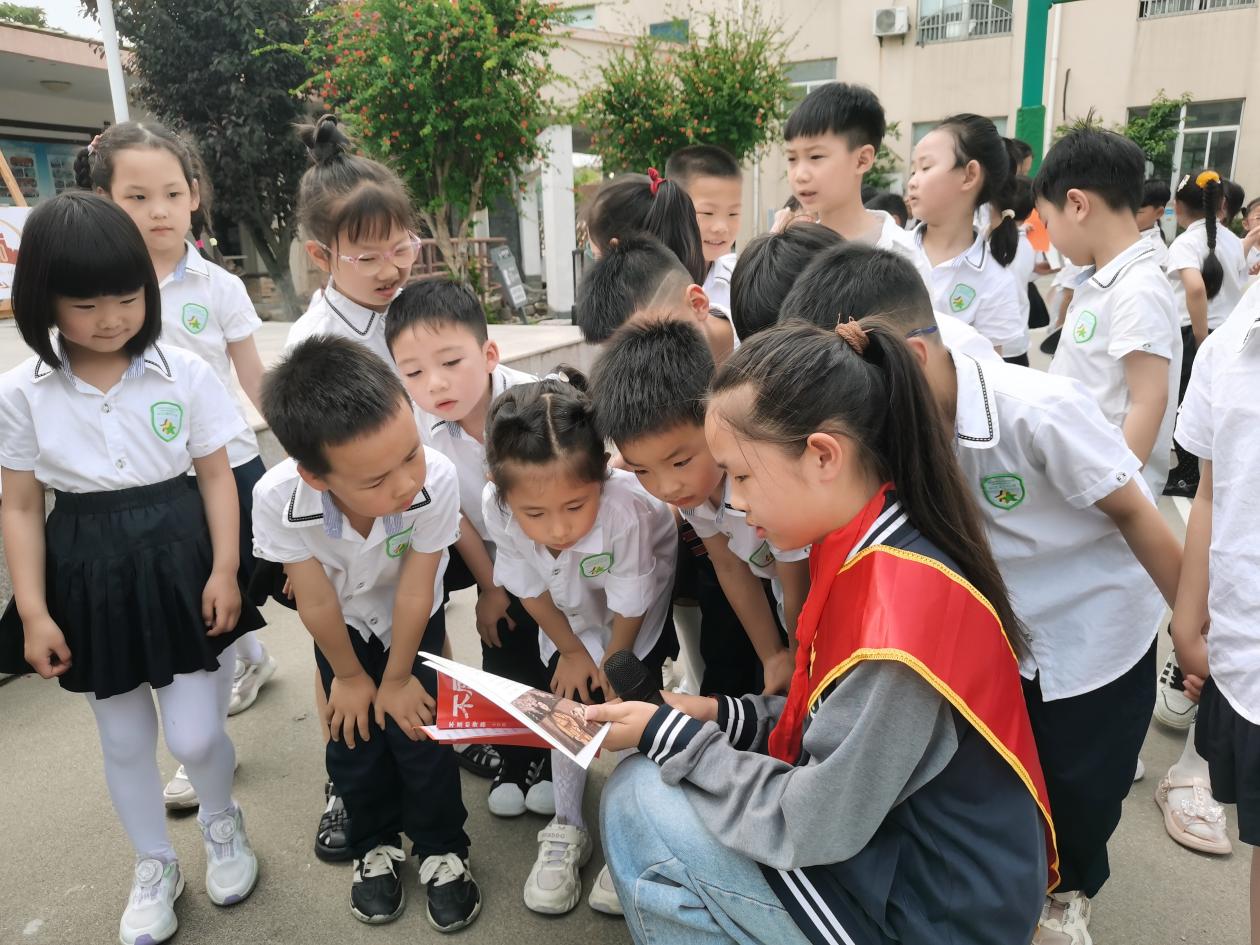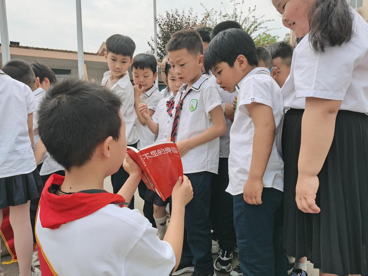 在学校少先队“红领巾队长学校”校园小导游的带领下,幼儿园小朋友们参观了彩虹大草坪,书香长廊,图书馆等校园景点。本次活动,恰逢中国人民抗日战争暨世界反法西斯战争80周年,来自山塘社区关工委陈晨老师为小朋友们讲述了《铮铮铁骨杨靖宇将军》的故事,大队委带领幼儿园小朋友们一起阅读《不屈的脊梁》,增强了孩子们你对历史的认知和理解,在幼小的心灵播种下爱国的种子。