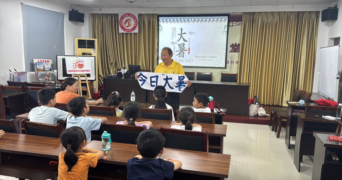 “小朋友,你们知道夏天最热的日子叫什么吗?”汾湖关工委五老志愿者张老师把写好的纸卷慢慢拉开,“今日大暑”,小朋友齐声读起来。五老讲节气,在镇西社区暑托班开场了。