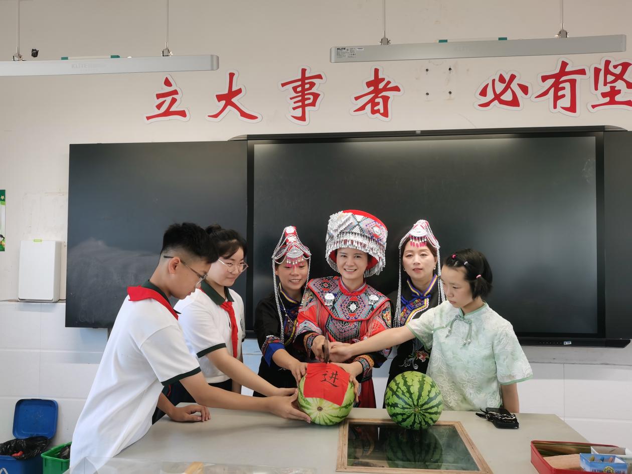 毕业典礼在雄壮的国歌声中拉开了序幕,吴江区人大代表、吴江区星星之光青年志愿者服务中心创办人和理事长、苏州市、吴江区青联委员,盛泽镇民族团结促进会副会长兰玲玲做客思政会客厅,为全体毕业生带来《励志逐光,青春启航》主题思政课。她结合自身从事志愿者服务经历,用生动案例阐释“责任与担当”的含义,勉励同学们“做有理想、敢追梦的新时代少年”。作为民族团结共建单位,来自畲族、土家族代表用自本民族语言向全体毕业送上祝福,并赠送西瓜,寓意“民族团结一家亲,携手共进”。让学生们铸牢“中华民族共同体意识”。