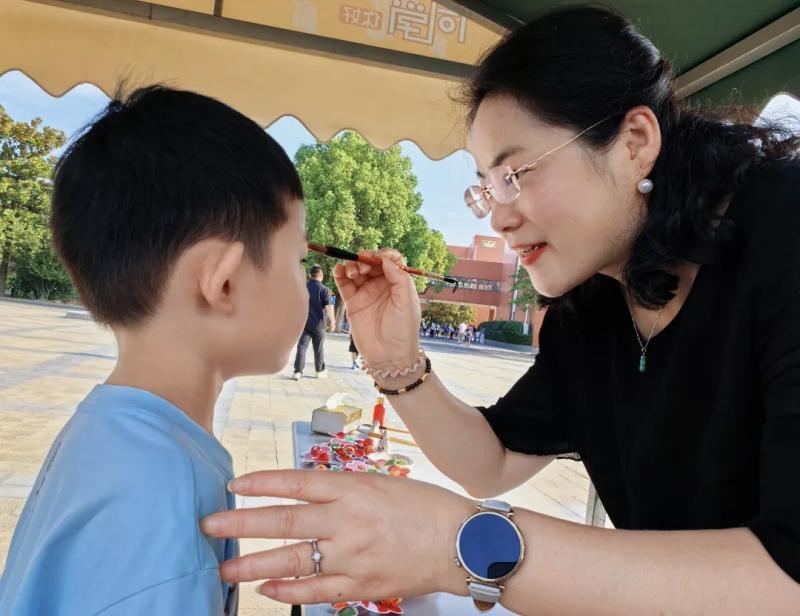 校门口,学校关工委朱主任与严校长等领导亲切地为每一位一年级新生点上鲜红的朱砂痣。“点朱砂,启智慧”,这一传统礼仪寄托着学校对孩子们从此眼明心亮、好学向上的殷切期望。随后,老师们为孩子们送上了小红花造型棒棒糖,甜蜜的礼物瞬间拉近了师生距离。
