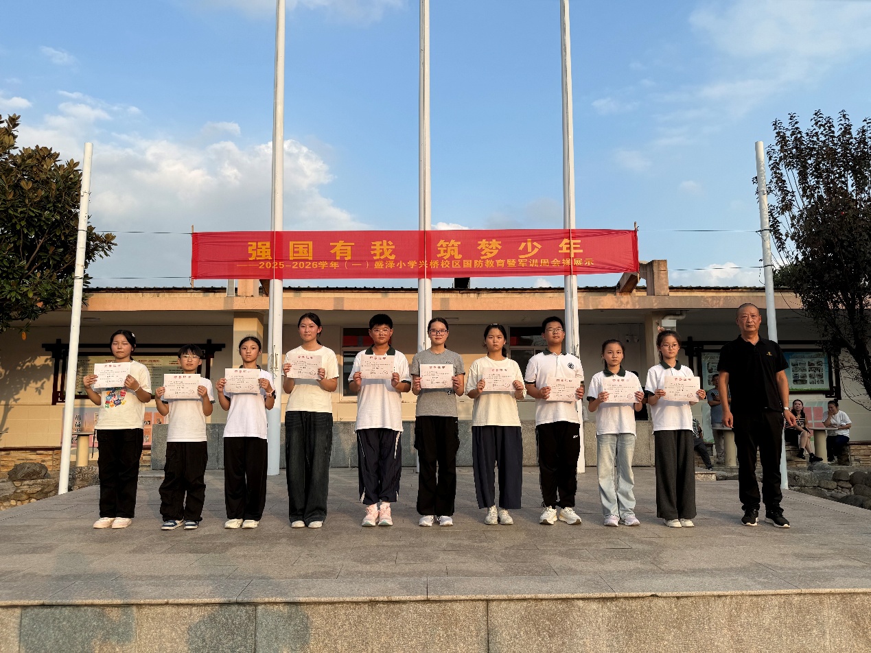 盛泽小学兴桥校区沈勤学校长、群铁村关工委“五老”代表董根林分别为本次军训中荣获优秀学员、优秀团队代表颁奖,沈勤学校长殷切期盼队员们在本次军训活动之后,能够拥有战胜困难的意志和能力,为自己的人生道路添砖加瓦,最后活动在嘹亮的《强军战歌》中落下帷幕。