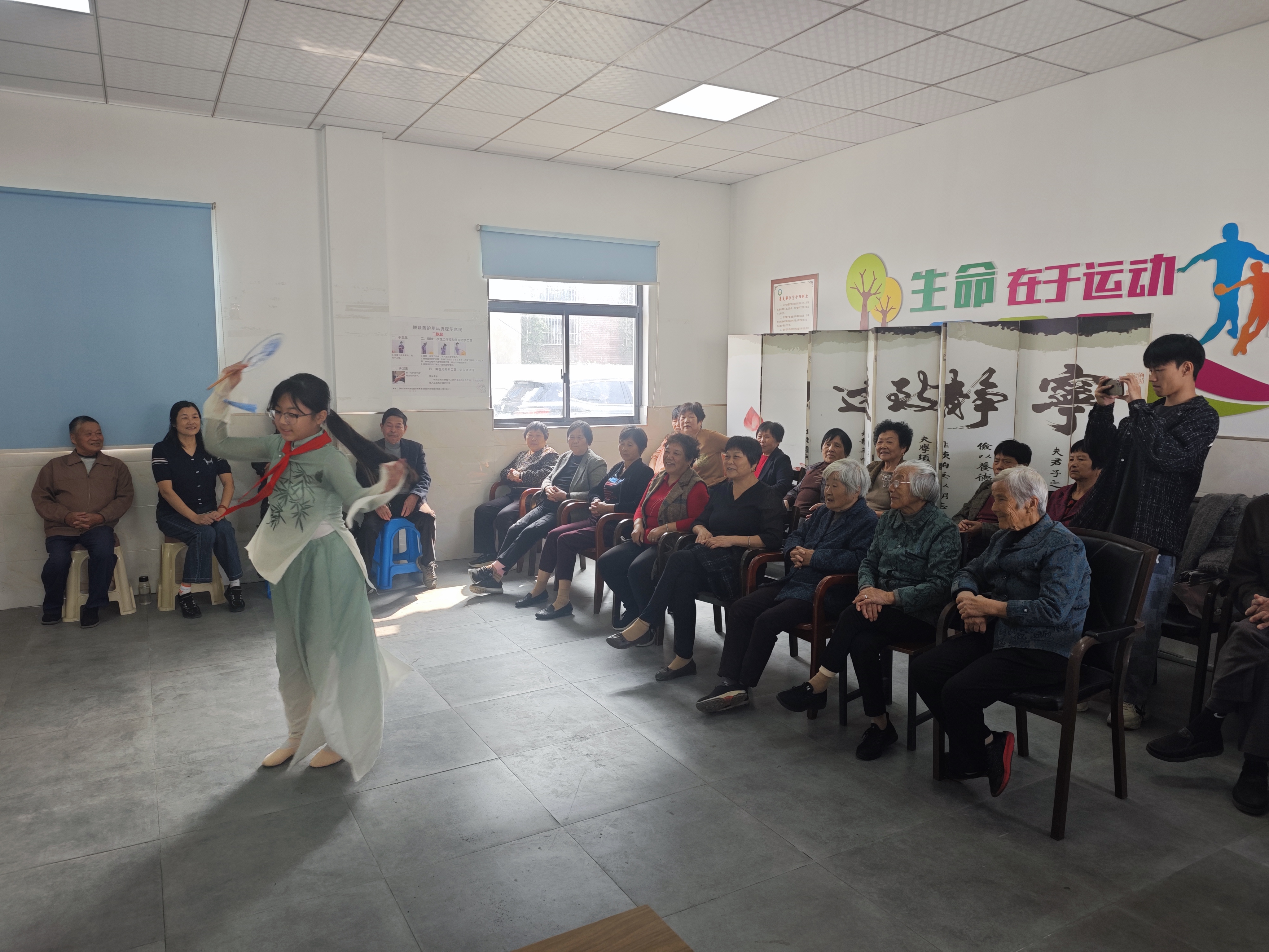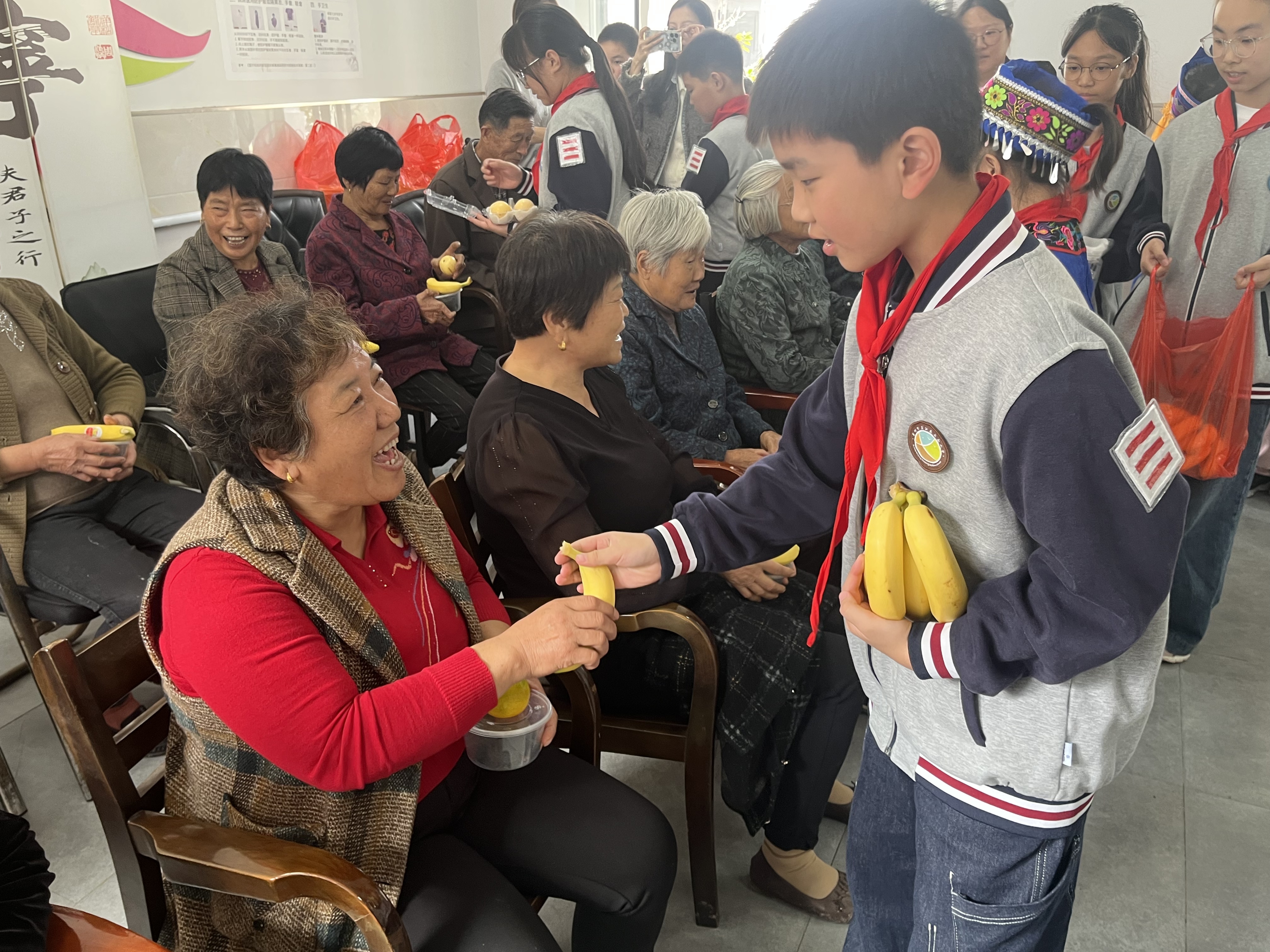 活动中,孩子们精心准备了诗朗诵、歌舞等节目。清脆的童声、灵动的舞蹈赢得老人们阵阵掌声,85岁的李奶奶笑着说:“这些孩子就像小太阳,照得我们心里暖洋洋!”表演结束后,孩子们为老人送上香蕉、橘子等水果,并送上祝福。随后,他们主动围到老人身边,轻轻为老人捏肩捶背。“爷爷,您肩膀酸不酸?我帮您按按。”稚嫩的话语和贴心的小举动,让老人们感动不已。