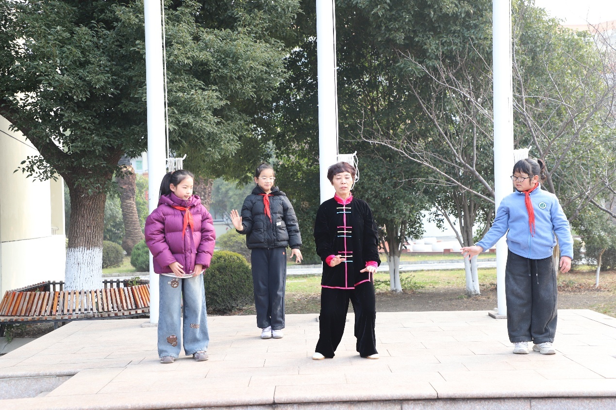 活动中,兴桥村关工委的陈奶奶现场展示了八段锦,动作舒缓而有力,诠释了传统健身运动的魅力,三名学生代表一同陪练,展现了老少同练、共享健康的生动场景。
