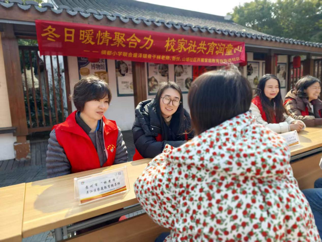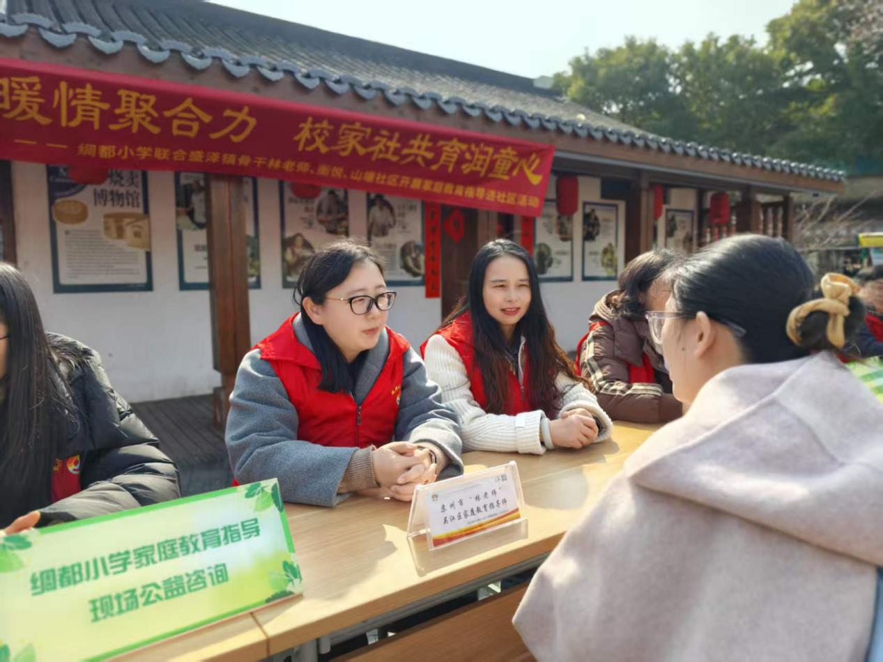 活动当天正值新春佳节,蚕花里戏台附近人头攒动,洋溢着节日的喜庆。来自绸都小学的家庭教育指导师以及盛泽镇骨干“林老师”们凭借丰富的教育经验,在古街旁设立起“临时咨询台”,吸引了众多市民驻足。面对年轻父母关于“如何培养良好学习习惯”的困惑,以及祖辈们感叹的“隔代教育观念冲突”等问题,老师们通过深入浅出的案例分析和互动答疑,引导家长树立正确的育人观念 。