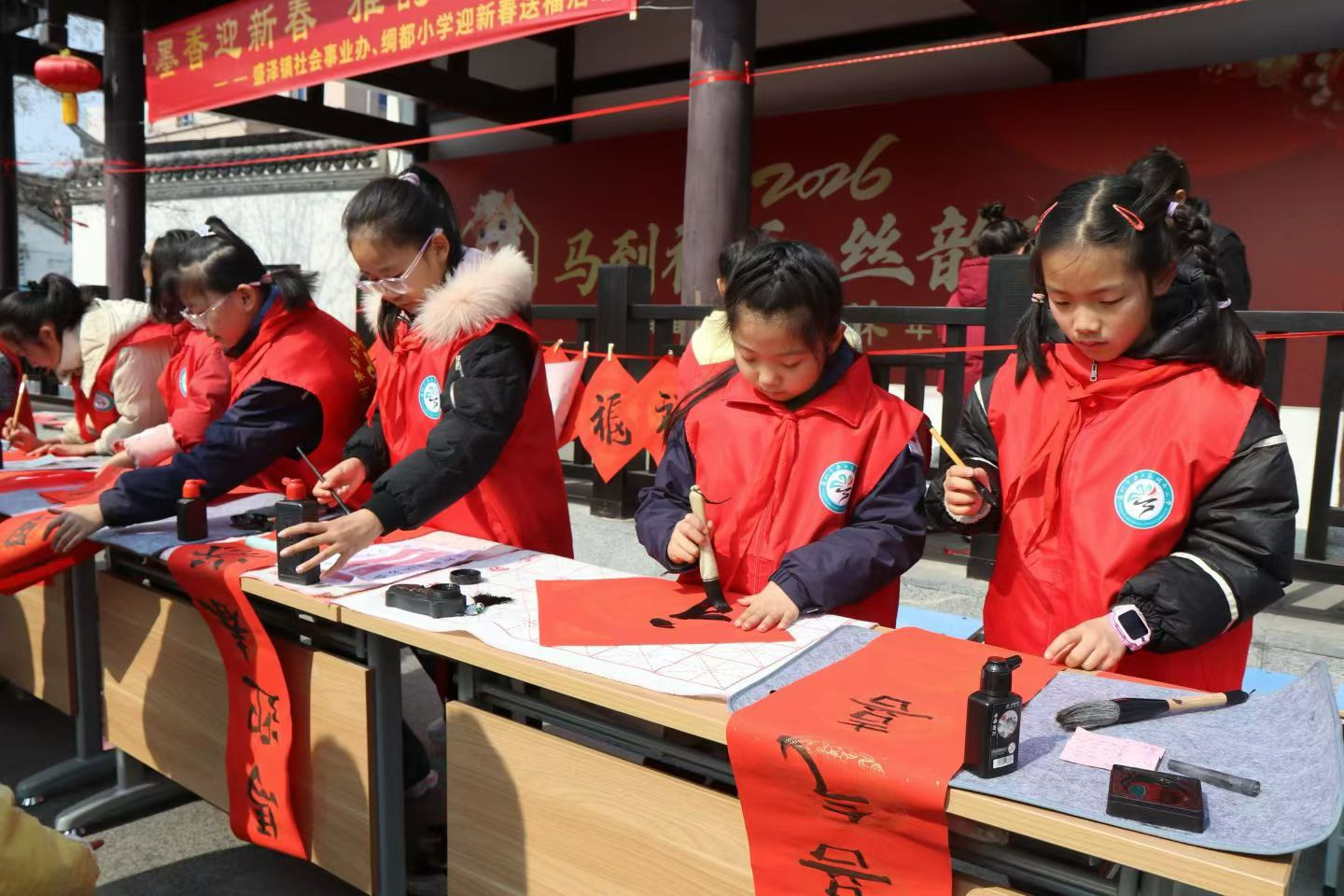 活动现场,绸都小学的少先队员们挥毫泼墨,凝神运笔,一幅幅寓意吉祥的春联和福字跃然纸上。红红的宣纸、浓浓的墨香,凝聚着孩子们对新年的美好祝愿。作为“绸小芽”志愿者,他们热情地将写好的春联和福字免费赠送给过往居民和游客,将新春的第一份祝福送到大家手中。