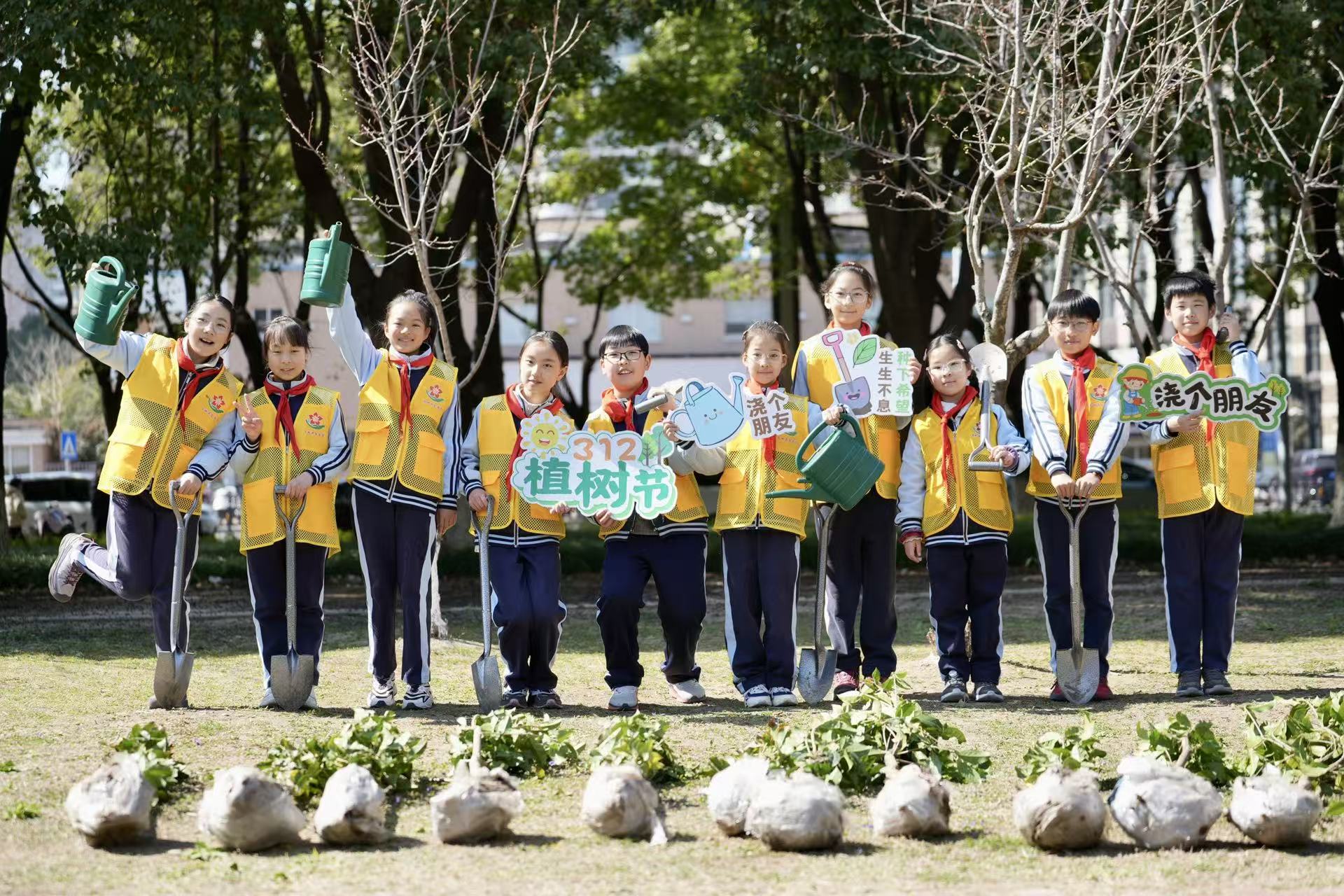 挖坑、扶树、培土、浇水……大家分工协作、干劲十足。一双双小手认真忙碌,一个个身影充满活力。